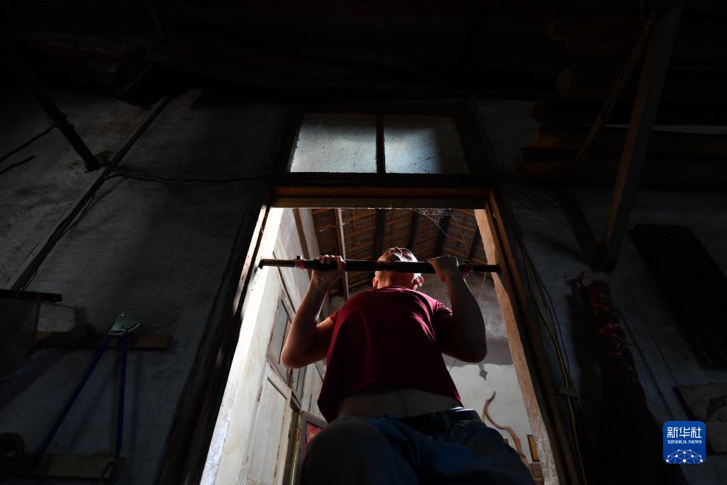 7月15日,在东安县井头圩镇八字门村,唐国强在休息时做引体向上活动身体。