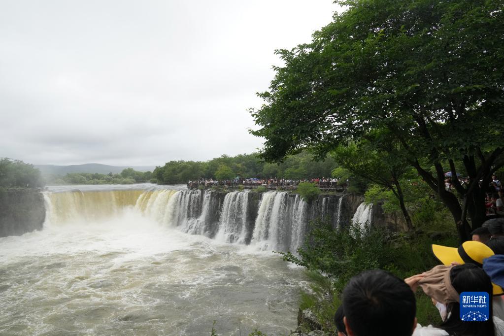 受上游来水量增多等因素影响,近日,位于黑龙江省牡丹江市的镜泊湖世界地质公园水量持续增加,景区内的吊水楼瀑布出现“三面溢流”壮观景象。