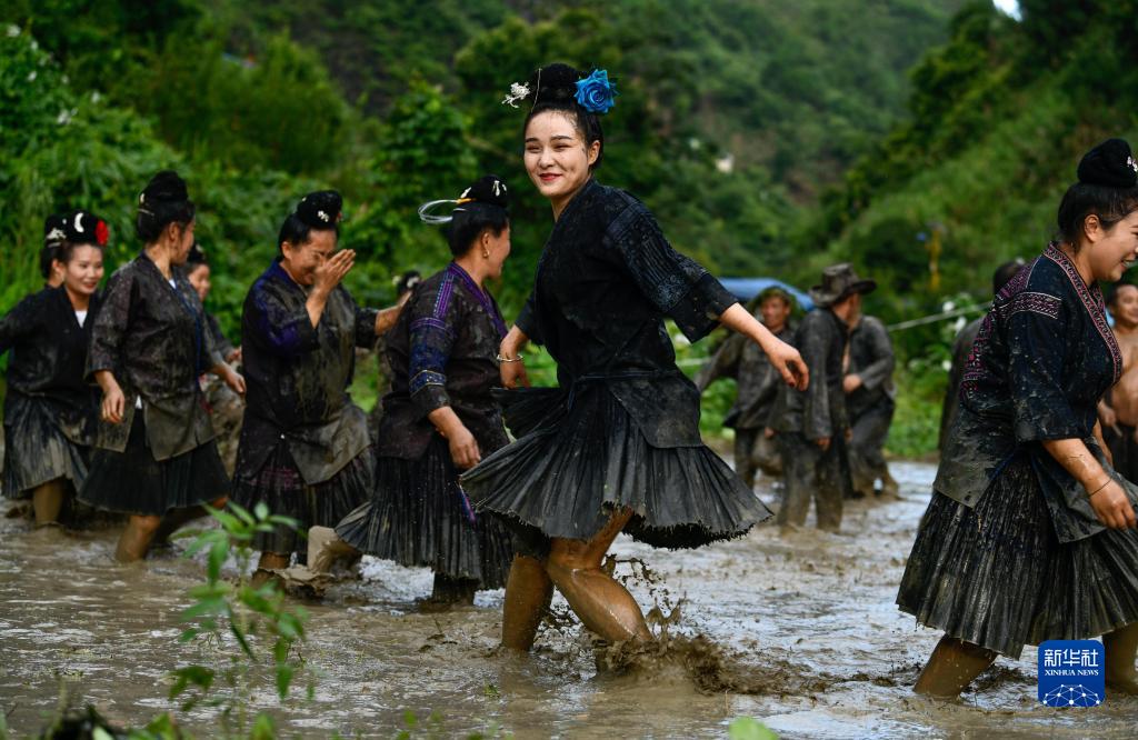 7月8日,剑河县仰阿莎街道大稿午村村民在表演水鼓舞。水鼓舞是贵州省剑河县苗族人民祭祀祖先、祈求风调雨顺与村寨平安的一种民间舞蹈。