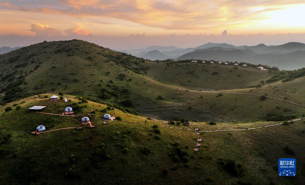 7月14日,朝霞映红了巴山大草原的露营场地(无人机照片)。