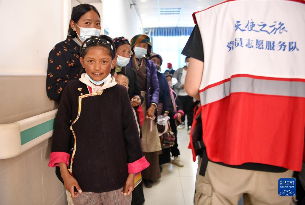7月9日,西藏山南市浪卡子县的儿童在家长陪伴下到县人民医院接受先心病筛查。