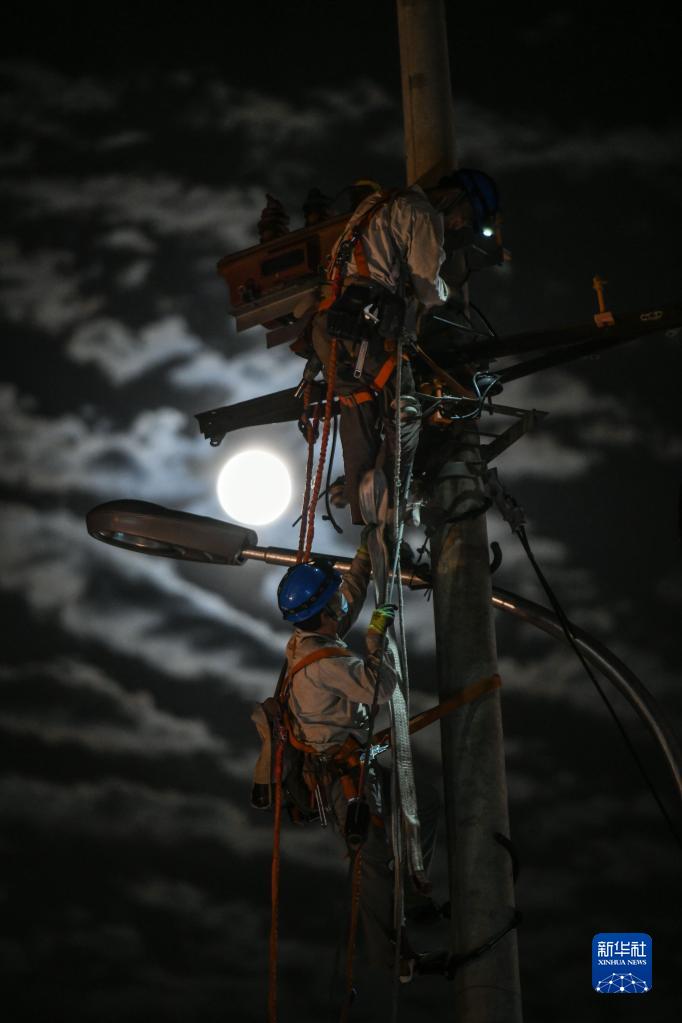 7月13日,在北京教子胡同北口,电力工人在夜色中施工作业。