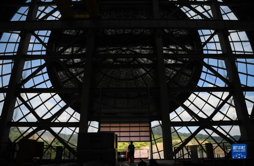 在广州市黄埔区的航空轮胎大科学中心,工人在进行室内装修(7月14日摄)。