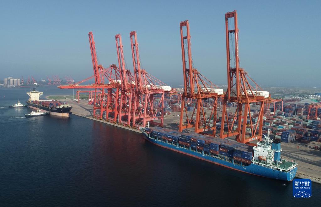 7月16日,两艘轮船靠泊在唐山港京唐港区集装箱泊位装货(无人机照片)。