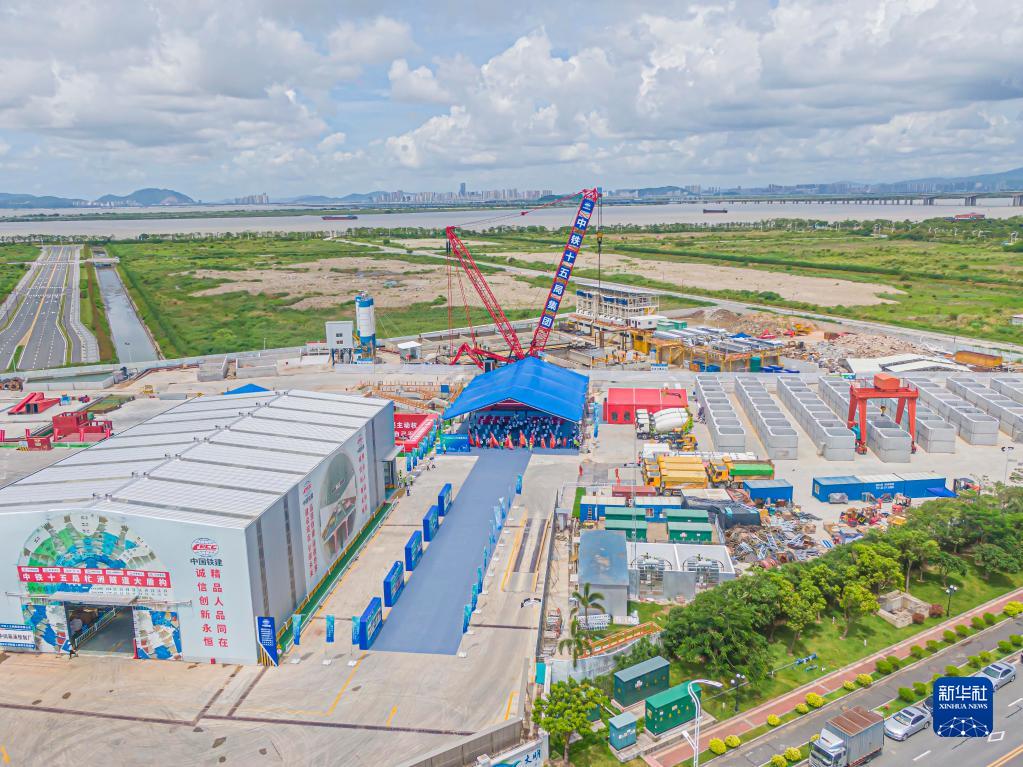 横琴杧洲隧道项目“振兴号”盾构机始发仪式现场(7月15日摄,无人机照片)。