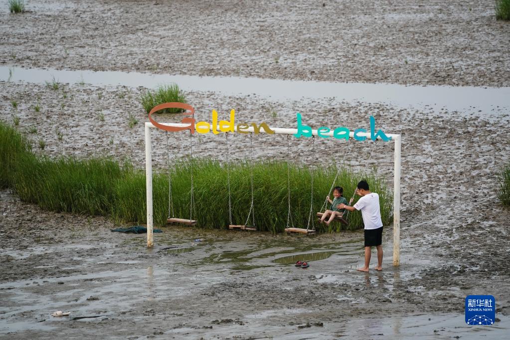 游人在启东黄金海滩景区内的黄海滩涂上休闲娱乐(7月16日摄)。