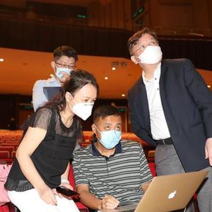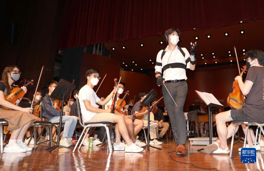在彩排中,香港浸会大学交响乐团音乐总监潘明伦身上多处绑着传感器,他不时与台下的技术团队进行沟通(7月11日摄)。