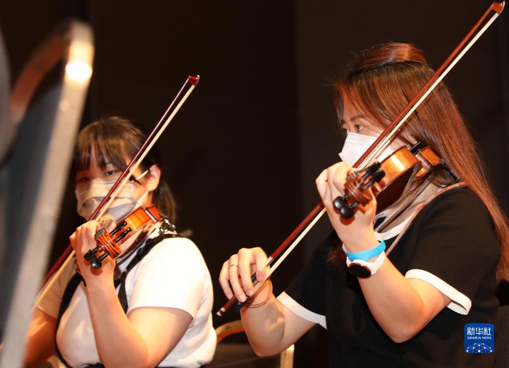 香港浸会大学交响乐团乐手在彩排中演奏(7月11日摄)。