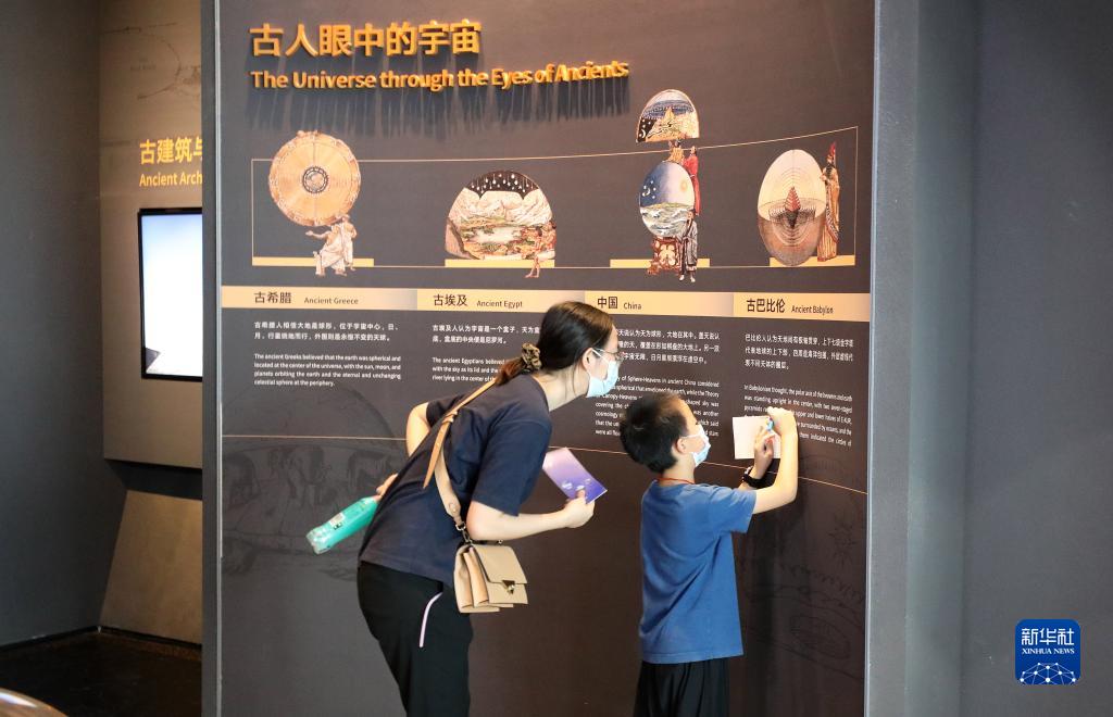 7月17日,一位小朋友在上海天文馆“征程”展区内边参观边记笔记。