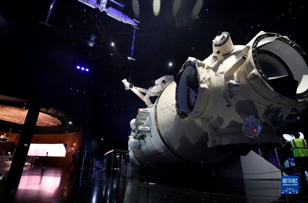 7月17日,参观者走在上海天文馆“征程”展区内的天和核心舱等比例模型旁。
