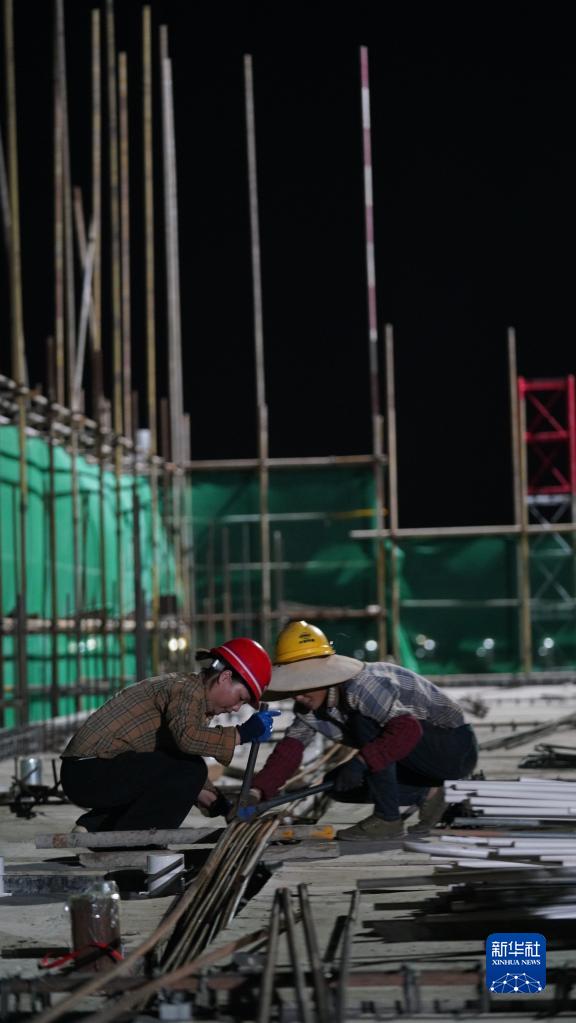 7月13日晚,谢赛文(左)在工地固定钢筋。