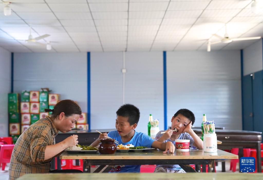 7月13日,谢赛文(左一)在工地生活区食堂和孩子们一起吃饭。