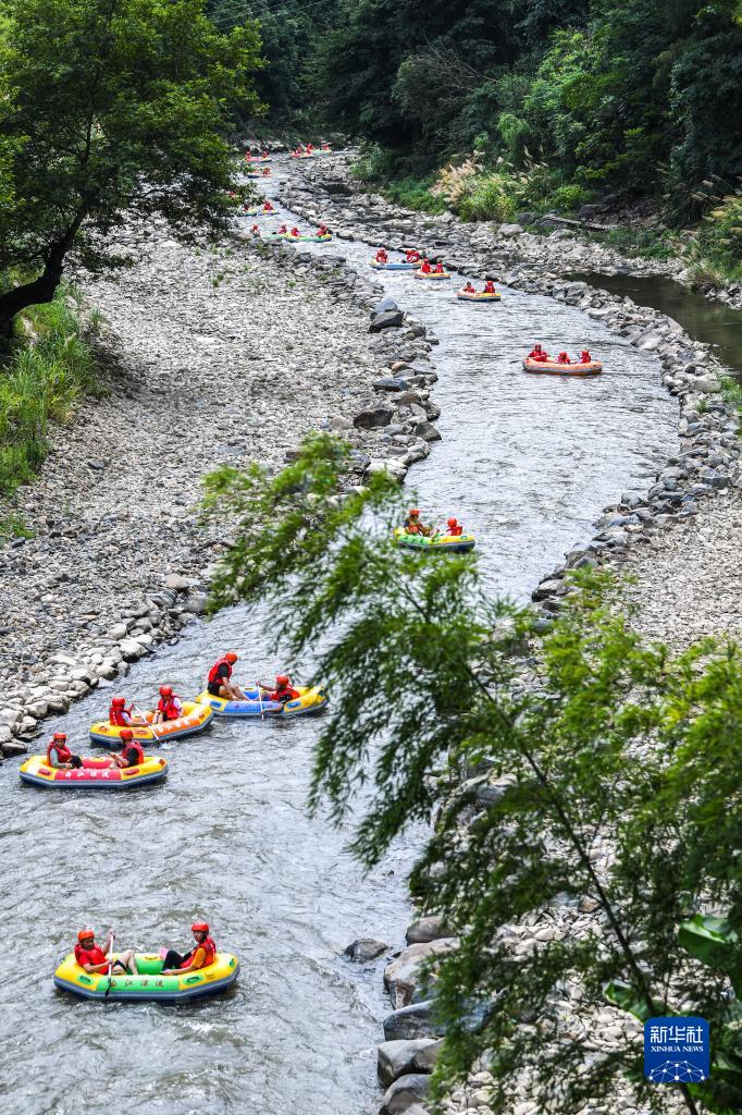 7月17日,在位于湖南省常宁市的天堂山国家森林公园,孩子们在家长的陪伴下体验水上漂流。
