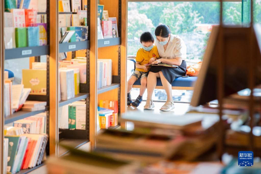 7月17日,家长陪伴孩子在南京一家书店内阅读。