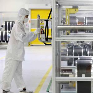 7月17日,在合肥一家动力电池生产企业的生产车间,技术人员在锂电池生产线上作业。