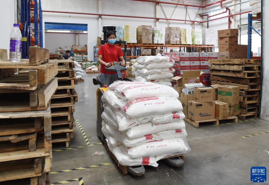 7月17日,在安徽省蚌埠市蚌山区百大智能物流园,工作人员整理向超市配送的商品。