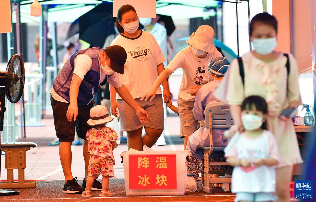 7月18日,在海口市第十四中学核酸采样点,志愿者在信息采集点维持秩序。