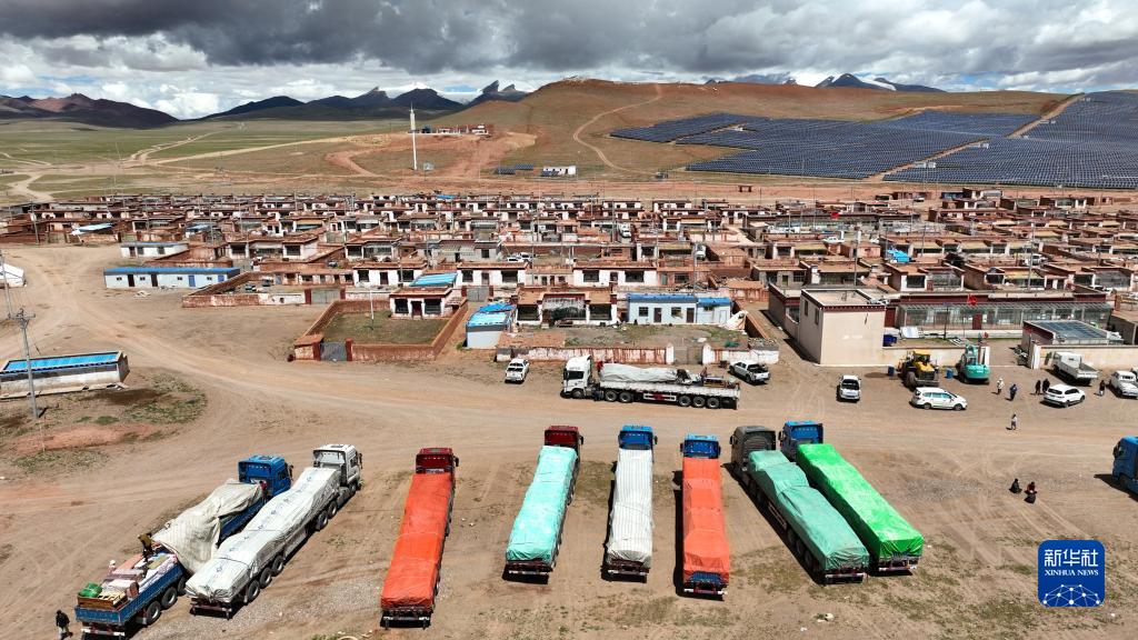 在双湖县多玛乡仲鲁玛村,运输家具的货车整装待发(7月13日摄,无人机照片)。