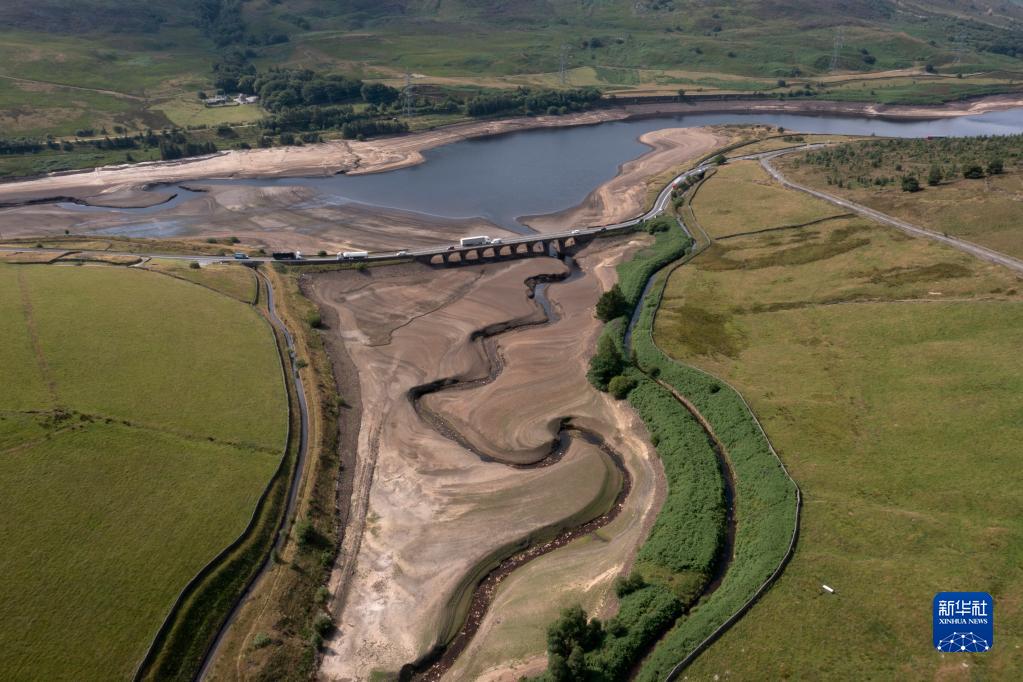 这是7月19日在英国曼彻斯特附近拍摄的几近干涸的伍德黑德水库(无人机拍摄)。