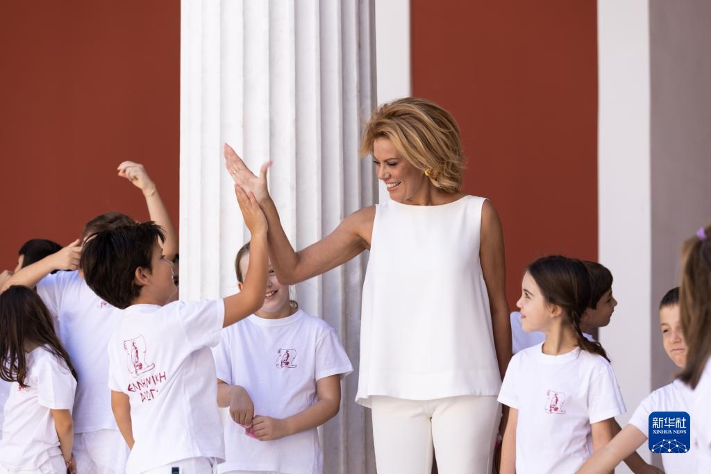 7月15日,欧耶尼娅·马诺利杜在希腊雅典扎皮翁宫与“希腊教育”学校的学生参加夏令营活动。