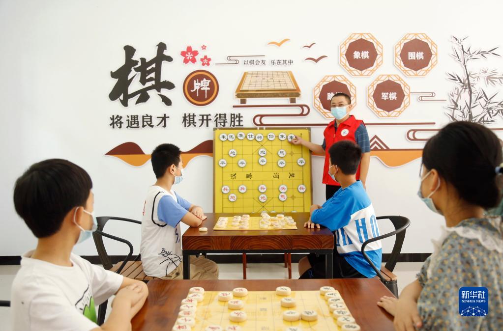 7月20日,在邢台市南和区三思镇新时代文明实践所,小朋友学习下棋。