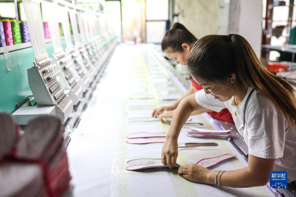 7月19日,30岁的杨丽(前)在克度镇马鞍社区一刺绣厂内工作。杨丽家是“中国天眼”所在“大窝凼”内的12户居民之一。2009年,杨丽家搬迁至克度镇的移民安置点。如今,杨丽在克度镇马鞍社区一刺绣厂内担任管理工作。新华社记者 欧东衢 摄