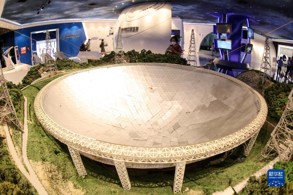 7月20日,参观者在天文小镇上的“天文体验馆”内观看“中国天眼”模型。新华社记者 欧东衢 摄