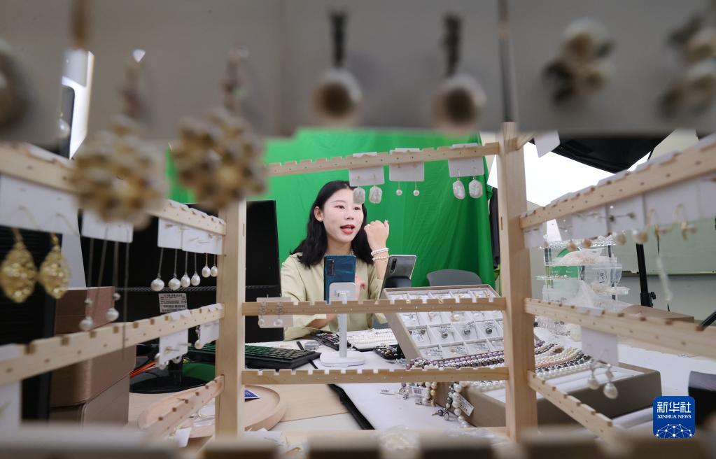 7月20日,浙江省湖州市德清县一家珍珠生产企业的电商主播在为珍珠产品带货直播。
