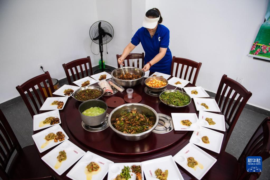 7月20日,工作人员在汉寿县龙阳街道社区日间照料中心为老人分餐。新华社记者 陈思汗 摄