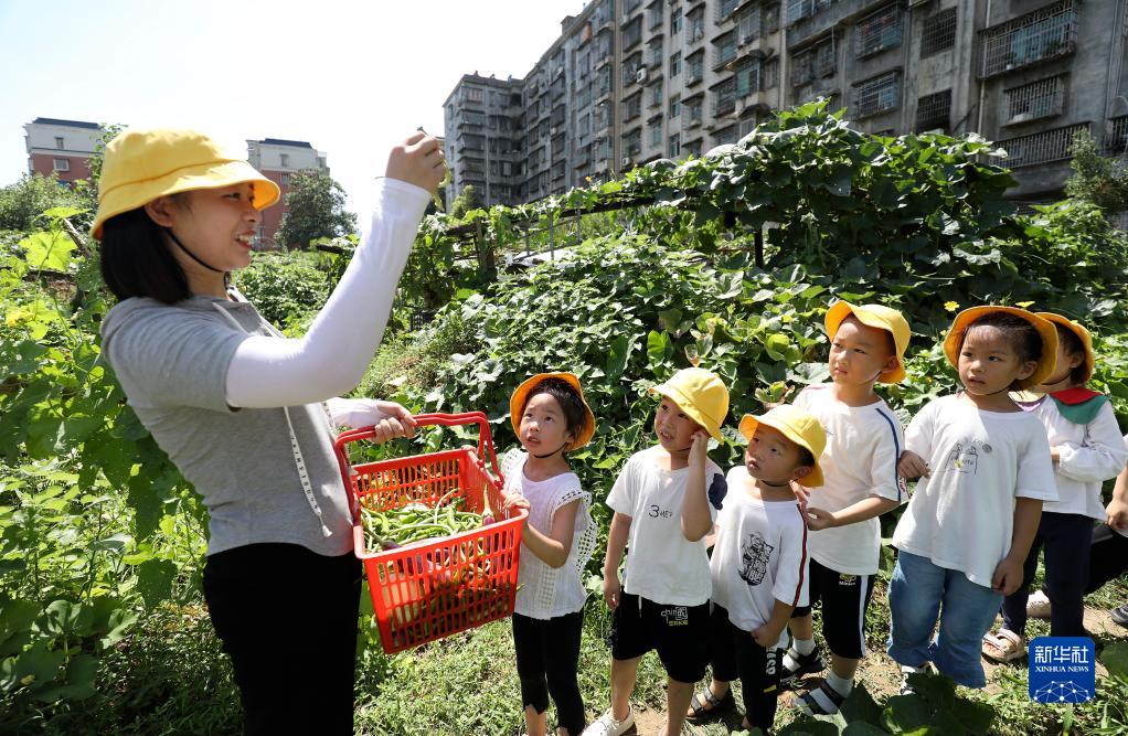 7月20日,夏令营的老师在菜园里向小朋友介绍蔬菜知识。