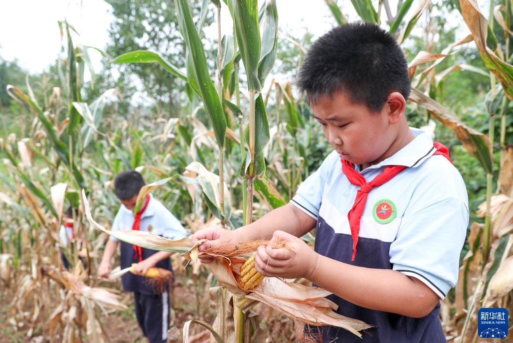 7月20日,四川省华蓥市双河三小的学生在帮助农家收获玉米。