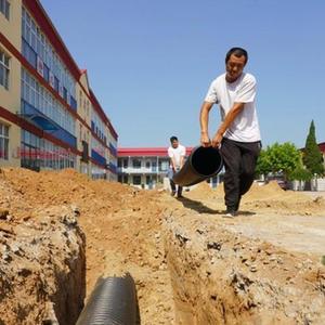 7月20日,工人操作机械在河北省临城县黑城中学校园内施工(无人机照片)。