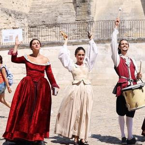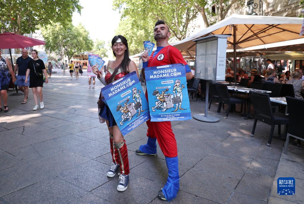 7月19日,在法国南部城市阿维尼翁,演员身着戏服在街头推介自己的剧目。