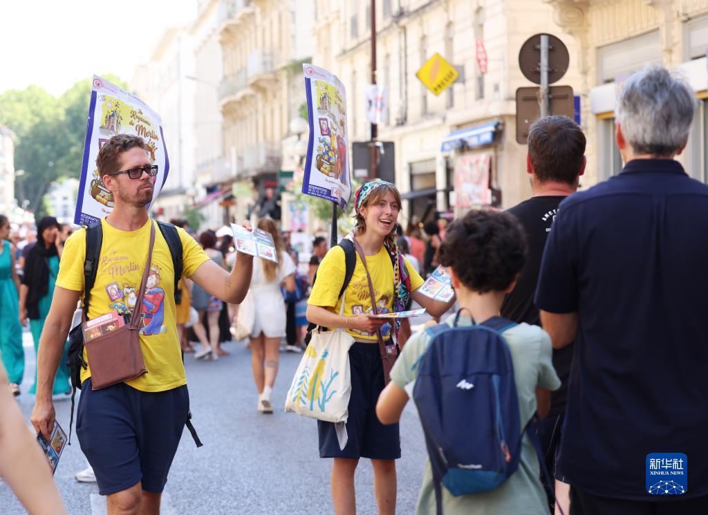 7月19日,在法国南部城市阿维尼翁,演员在街头推荐剧目。