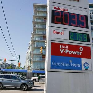 7月20日,加拿大温哥华一处加油站的油价牌显示当天油价。