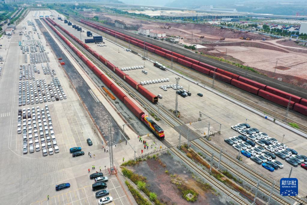 7月21日,在重庆鱼嘴站,重庆-莫斯科首列中铁特货商品车国际班列等待发车(无人机照片)。