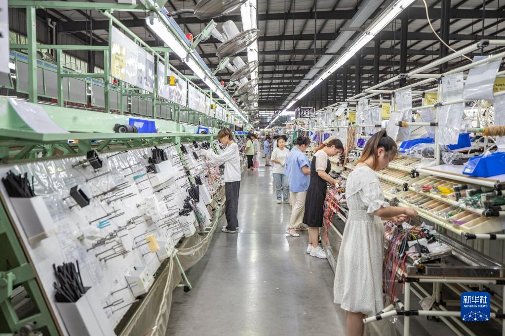 7月19日,重庆长秦汽车配件有限公司的工作人员在后工序车间进行线束生产作业。