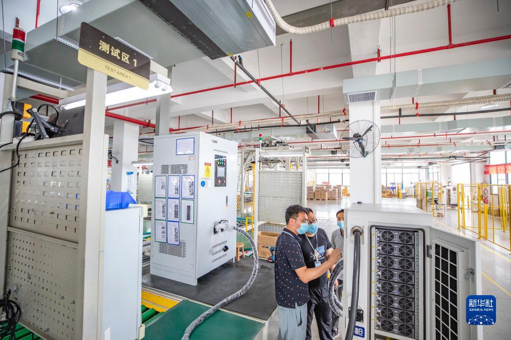 7月19日,在重庆惠程未来智能电气有限公司生产车间内,工作人员对生产好的充电桩进行通电测试。