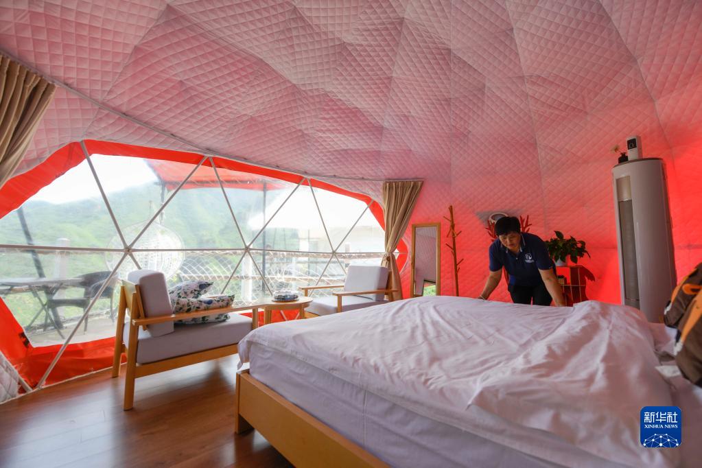 7月21日,在兴隆县雾灵山镇一家民宿,工作人员周桂君在整理房间。