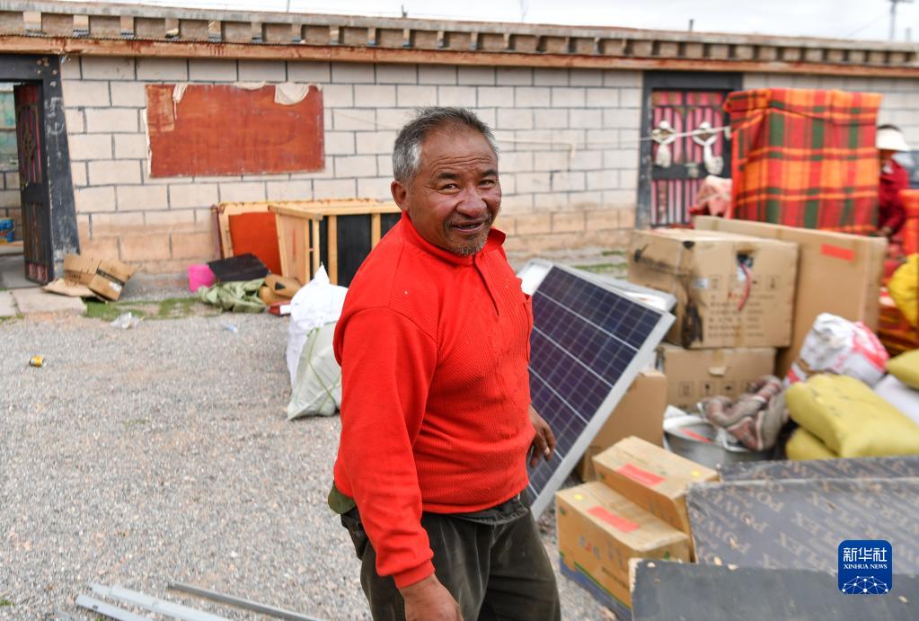 双湖县多玛乡仲鲁玛村牧民索朗措加在整理即将搬运到森布日安置点的家具(7月12日摄)。