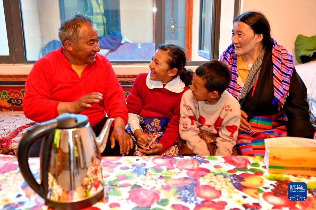 刚刚从双湖县多玛乡搬迁到森布日安置点新居的牧民索朗措加(左一)和妻子查格(右一),与孙女旦珍卓嘎(左二)和孙子归桑桑旦一起聊天(7月19日摄)。