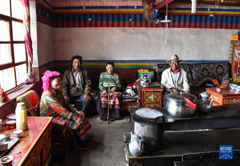 贡觉(右一)一家人在双湖县多玛乡果根擦曲村的家中(7月12日摄)。