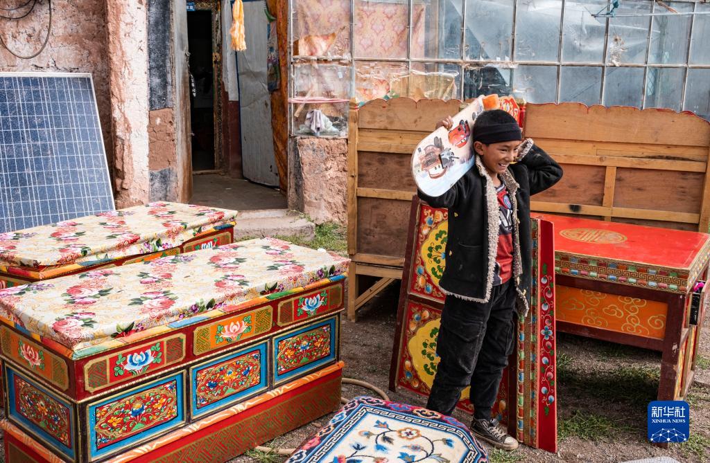 双湖县多玛乡仲鲁玛村的孩子拿着自己心爱的滑板。虽然滑板的轮子已经掉了,他还是想带到新家去(7月13日摄)。