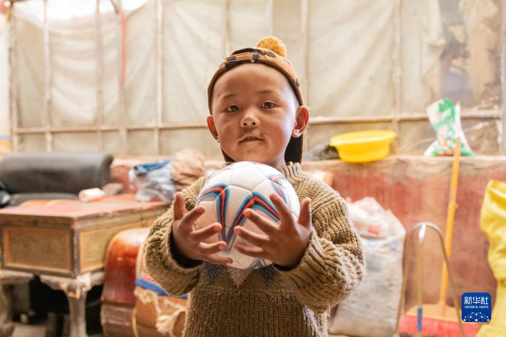 在双湖县多玛乡果根擦曲村,三岁的洛桑赤勒手里抱着足球(7月12日摄)。