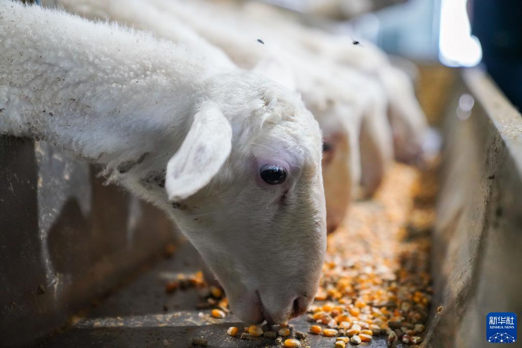 7月21日,伊春森工铁力林业局公司湖羊生态循环产业园中的湖羊在吃饲料。新华社记者 王松 摄