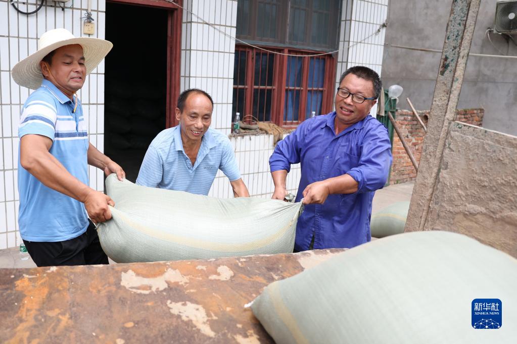 7月21日,在湖南省沅江市共华镇福安村,粮食经纪人吴锋高、江新华和出售稻谷的村民高再军(左起)将称重过的稻谷搬运上车。