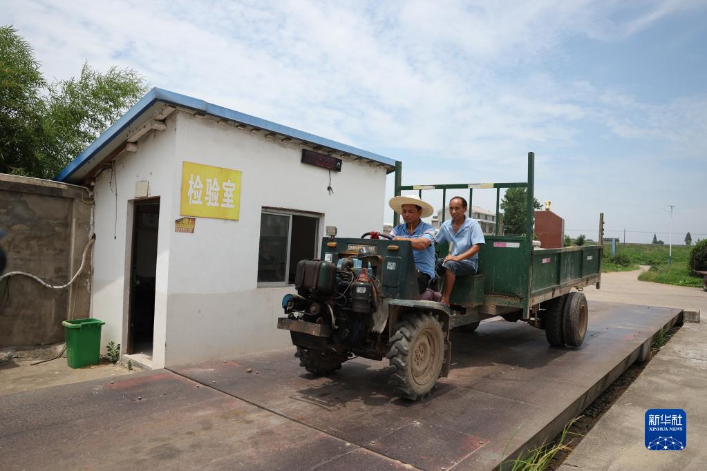 7月21日,在湖南省沅江市共华镇福安村,粮食经纪人吴锋高(左)、江新华将收购的稻谷运到米业公司称重。在这里,稻谷经过称重、质量检测后将会入库储存或加工,之后交给国库或进入市场。
