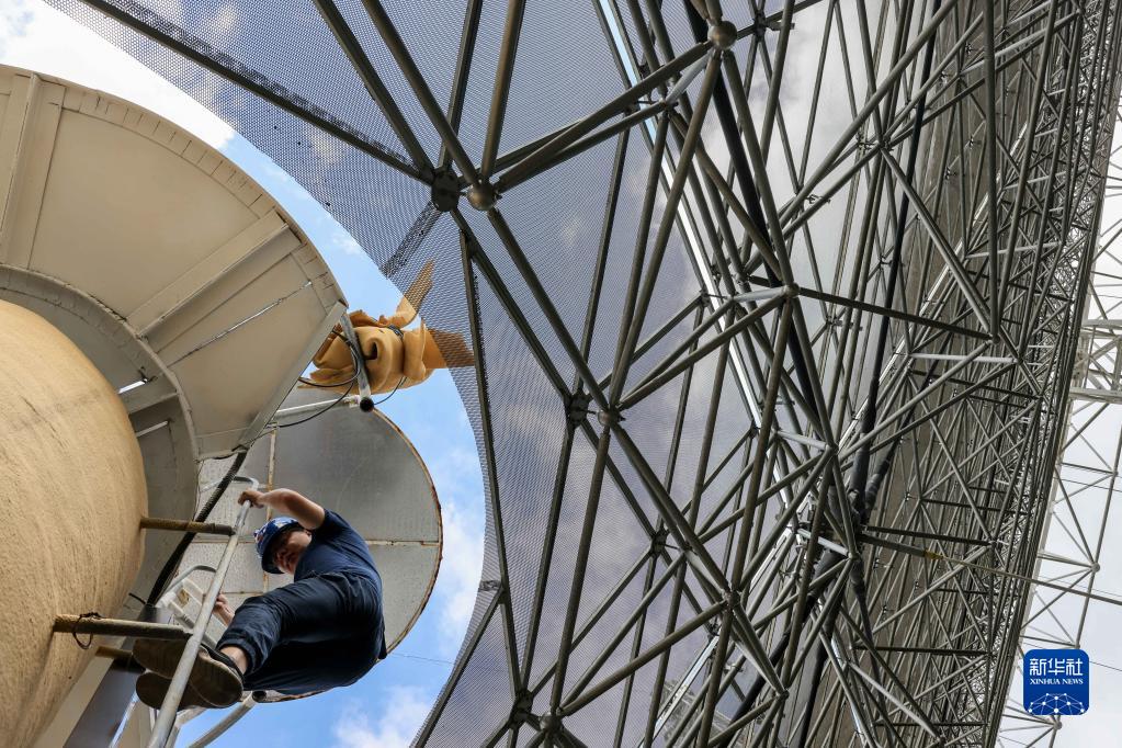7月22日,工作人员从“中国天眼”的测量基墩上走下(维护保养期间拍摄)。 新华社记者 欧东衢 摄