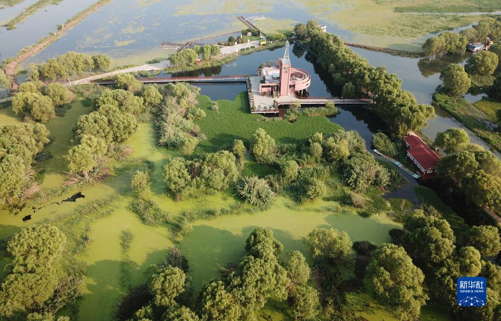 位于微山湖旅游区内的微山湖国家湿地公园和水质监测站(7月21日摄,无人机照片)。
