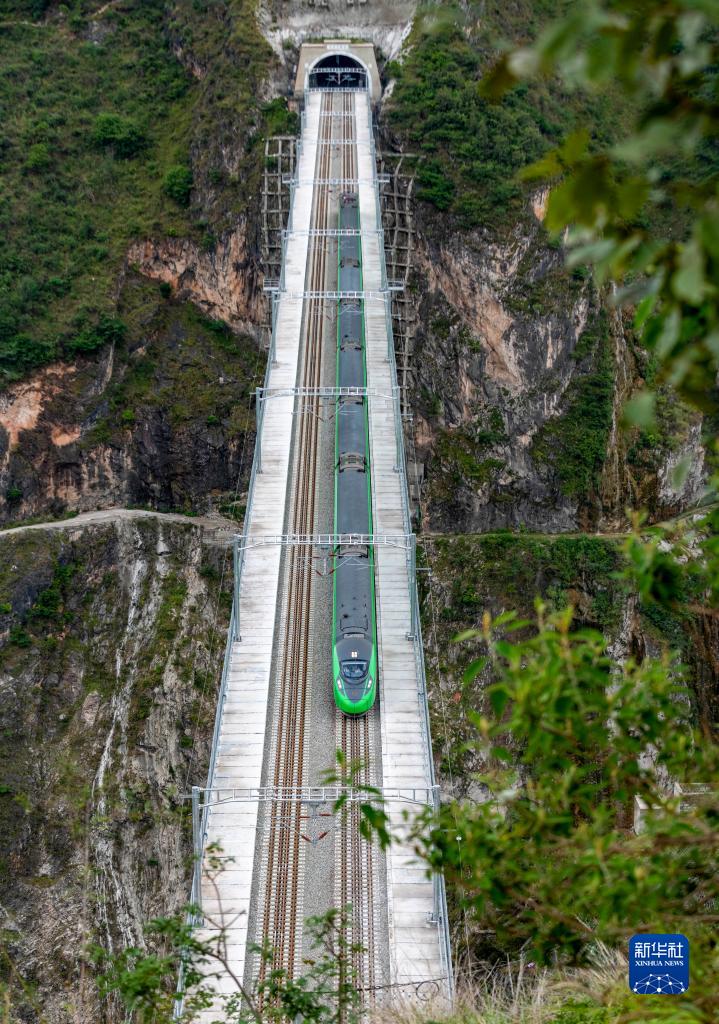 7月22日,复兴号列车通过大瑞铁路大保段澜沧江特大桥,远处为大柱山隧道。新华社记者 陈欣波 摄
